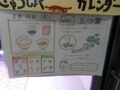 今日の「あげたま煮」は,黄色,緑色,赤色,白色など,見た目にも色鮮やかでした。この中の緑色の正体は「三つ葉」です。この「三つ葉」は,1本のくきに3枚の葉がつくことから「三つ葉」とよばれています。さわやかな香りやきれいな緑色,シャキシャキとした食感が特徴です。