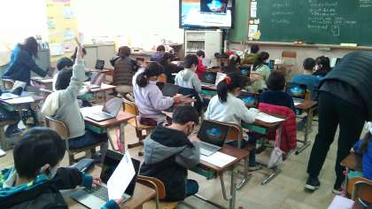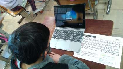 一人一台GIGA端末を使って動画や写真を撮る学習をしました。電源を入れ,ユーザー名やパスワードを入力します。おたすけシートを見ながら,友達と協力して起動することができました。