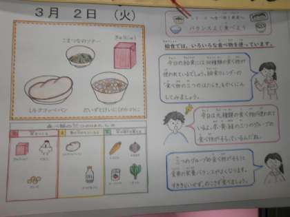 ・ミルクコッペパンはふわふわしていて,おいしかったです。だいずとけいにくのトマトにはだいずがやわらかくて,おいしかったです。(1年)
