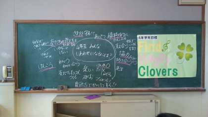 1回目の学年集会を行いました。4年生学年目標は「Find Happy Clovers」です。「みんなが幸せになるには?」と聞くと,「助け合う」「笑顔」「きまりを守る」「友達の気持ちを大切にする」など素敵な意見がたくさん出ました。