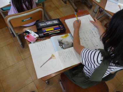 問いと答えをたしかめながら,ワークシートに書き写し,文章にあった絵もかきます。