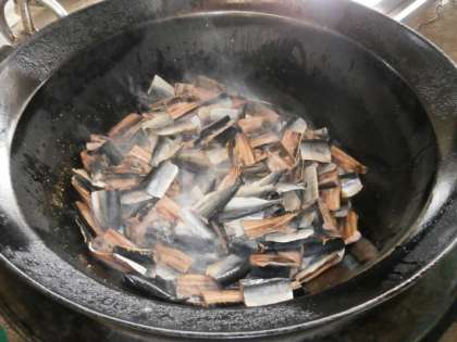 今日の給食では,まず三温糖,みりん,こいくちしょうゆ,みりんの中に,まずにしんを入れて煮ます。そのあと同じ煮汁でなすを煮ます。こうすることで,にしんのおいしいあぶらがなすに吸いこまれます。