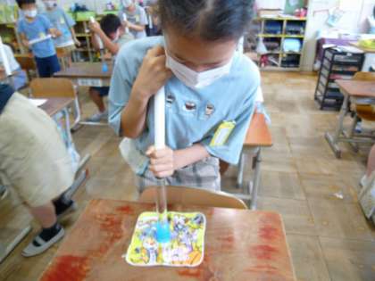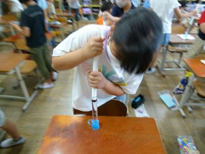 今度は水で実験!空気のように小さくなると予想した子が多かったのですが,結果は「水の体積はほとんど変わらない。」でした。いくら押してもほとんど動かず,何で!と大盛り上がりでした。