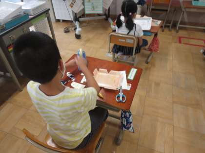 つくしの みんなは, みずあそびの どうぐをつくっています。