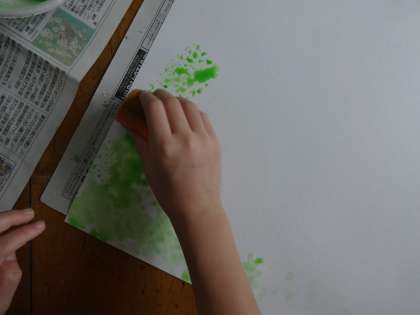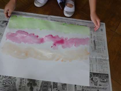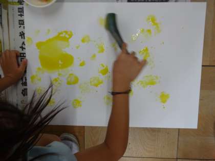 ブラシやスポンジ,ローラーなどの道具をつかって個性あふれる元気いっぱいの模様がたくさんできました。