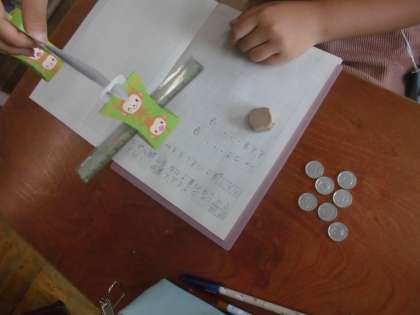 教科書の巻末にある天秤(てんびん)を作って,文房具の重さを調べました。