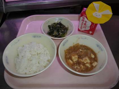 「ごはんはいつもとちがう米でかたかったです。米がちがうだけで味もかわりました。マーボーどうふはちょうどよい辛さでおいしかったです。ほうれん草ともやしのいためナムルを甘ずっぱくてとてもおいしかったです。いつもおいしいきゅう食をつくってくれてありがとうございます。」(3年生)