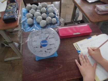 初めに,箱の中の粘土を一つの丸い形にして重さを測りました。
