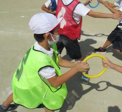 リングバトンを使って,みんなでバトンをつなぎます。