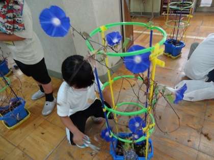 大きく長く成長したアサガオのツルをほどいていくのは大変です。