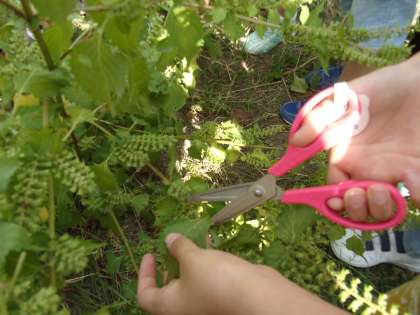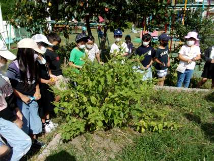 1学期に幼稚園の「花売り屋さん」でもらって育てていたシソの苗が大きくなったので,葉を収穫しました。