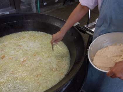 とまとだご汁では,片栗粉,米粉,塩,水,ホールトマトをたくさんこねて,もちもち,ふわふわのだんごをつくりました。うすいピンクのきれいな色をしていましたね。