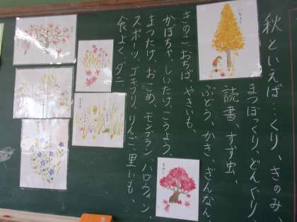国語科の時間に,「秋がいっぱい」の学習で,秋を感じる言葉をたくさん探しました。生き物,植物,食べ物など,様々なジャンルでたくさんの「秋」を感じる言葉を見つけることができました。