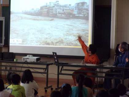 2013年に発生した台風18号の時の伏見南浜の被害の様子やその時のことについて,写真等を使ってお話しいただいたことで,自分たちの暮らす街でも大きな被害があるということがわかりました。