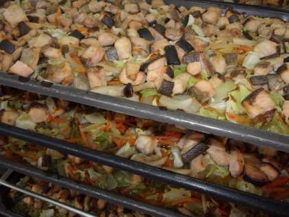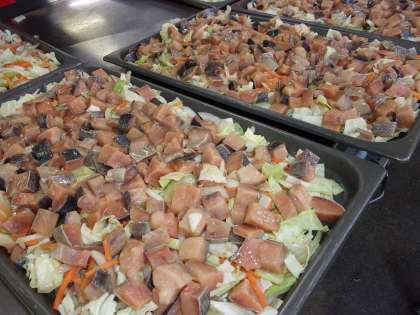 今日は野菜を鉄板にしいた後,みそだれをつけたさけをのせて,スチームコンベクションオーブンで焼きました。