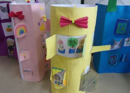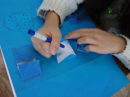 窓ができたら,窓の中に見えるものを描いていきます。窓に模様を付けている人や,別の紙で作った飾りをつけている人もいました。それぞれの工夫がたくさん見られました。