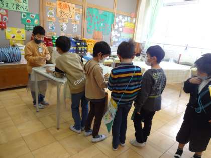 色を英語で伝えるだけではなく,big・smallなどの英語表現や一気に『6枚ください。』などの数も英語で表現することができています。