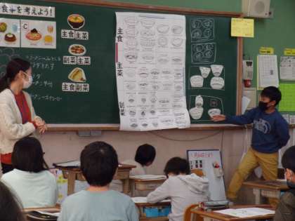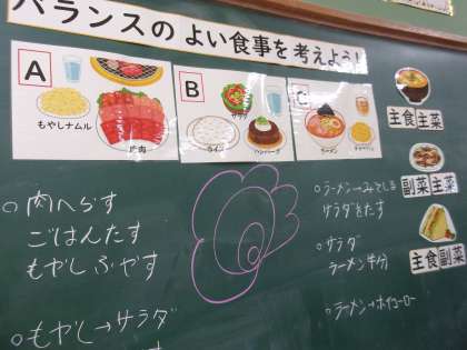 栄養教諭の岩武先生に「バランスのよい食事」について教えていただきました。まず,ABCのメニューを見て,どの食事がよいか考えました。そして,どんなメニューを足すとよいかを考えました。