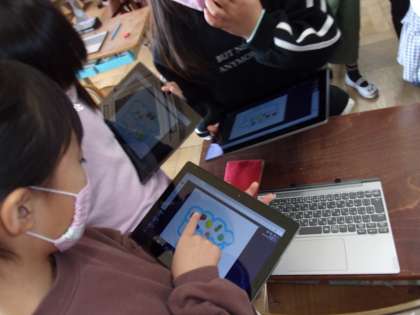 英語活動の時間に,GIGA端末を使って,フルーツポンチを作りました。10種類あるフルーツの中から,ほしい数を友達とのやりとりを通して集め,自分だけの素敵なフルーツポンチを作ることができました。