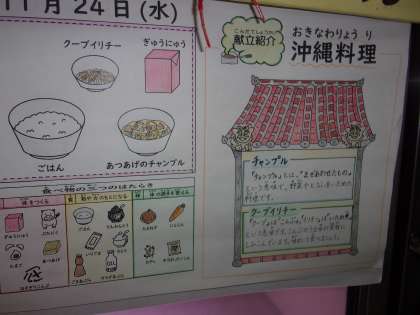 「あつあげのチャンプルは温かくて,ごはんとよく合ったし,ほっぺが落ちそうなくらいおいしかったし,さすが沖縄料理だなと思いました。クーブイリチーはシャキシャキしていたので,おいしかったです。いつもおいしいきゅう食を作ってくれてありがとうございます。」(3年生)