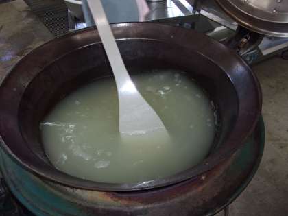 給食室では寒天の粉を水にいれ,沸騰するまで約50分間も混ぜ続けています。