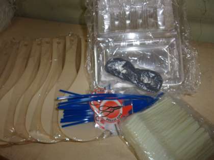 炊いたお米をすくうしゃもじ,それを入れるビニールのパック,それをとめる輪ゴム,段ボールを切るカッターです。