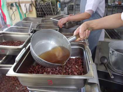 これらは給食室でクラスごとに豆と汁の量を測り,ホテルパンという容器にいれます。