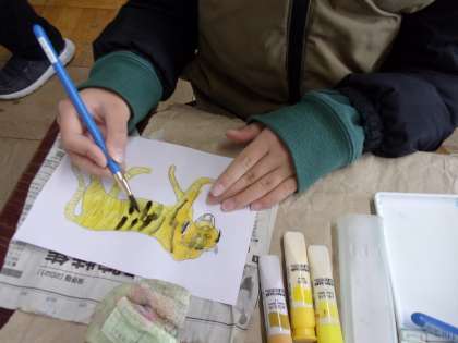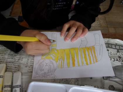 今日は看板づくりをしています。小さなトラを一人ひとりが描いて,大きな看板に貼る予定です。みんな丁寧に描いていますよ。