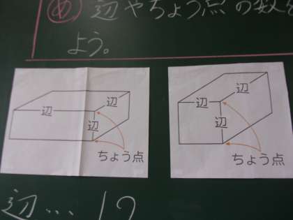 算数科で,「はこの形」の学習をしています。辺やちょう点の数を調べました。どんな大きさや形の箱にも,同じ数だけ辺やちょう点があるとわかりました。