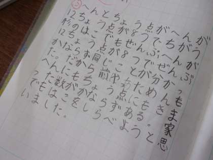 振り返りもきっちりと書くことができています。ぜひ,家でも色々な箱を見て,辺やちょう点の数を調べて確認してみてくださいね。