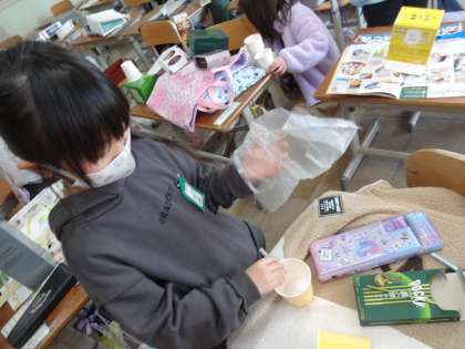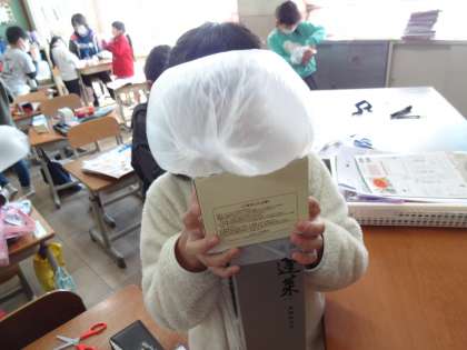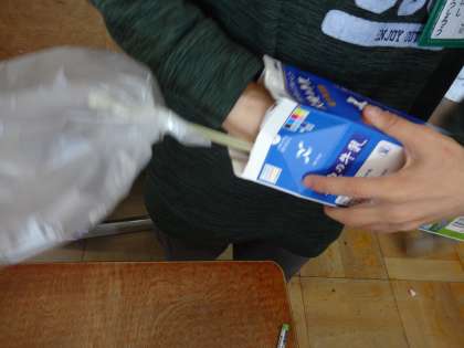 ストローとポリ袋をつなぎ合わせ,にょきにょき装置をつくっています。