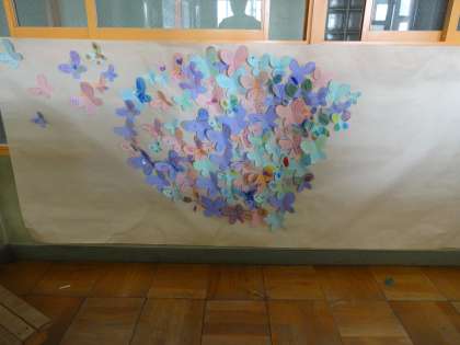 もうすぐ卒業する6年生への「ありがとう。」「おめでとう。」の気持ちを伝えるために,ちょうちょを彩っています。