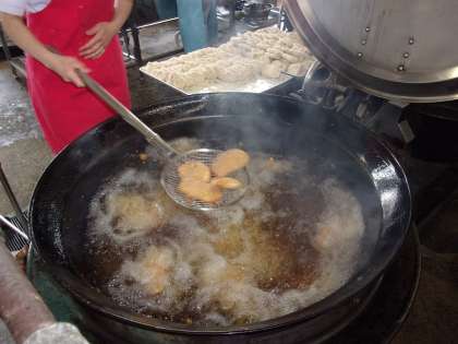 そして油に入れてカリッと揚げて,しっかり油をきってクラスごとに食缶に入れていきます。