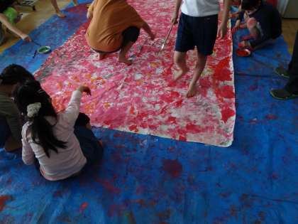 春のイメージや色を話し合い,絵の具で大きな模造紙にみんなで表現しました。ローラーや筆,スポンジ,自分の手足などで表現する方法を知り,表現を楽しみました。教室前の廊下に掲示してありますので,来校の際はご覧ください。