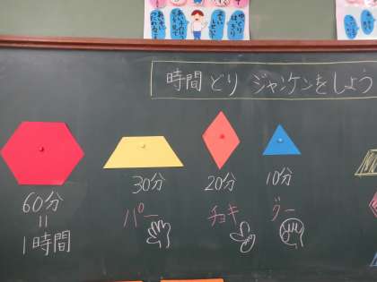 時間とりじゃんけんというゲームをしながら,楽しく時間について学んでいます。