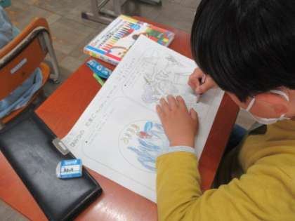 不思議なたまごの中から,どんな世界が飛び出てくるのかを 想像をふくらまして 描いています。どんな作品になるのか楽しみです。