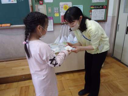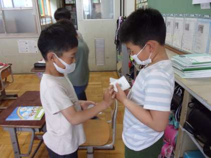 外国語活動の時間に自己紹介をしました。名刺カードを作り,英語でやり取りしながら,カードを友だちと交換します。友だちの好きなものの絵もかいてあるので,もらってお互いに笑顔になっていました。