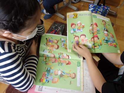 後半は,気分を尋ねる学習です。教科書の絵を見て,それぞれの子どもたちの気分を想像して答えていました。