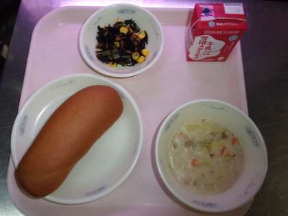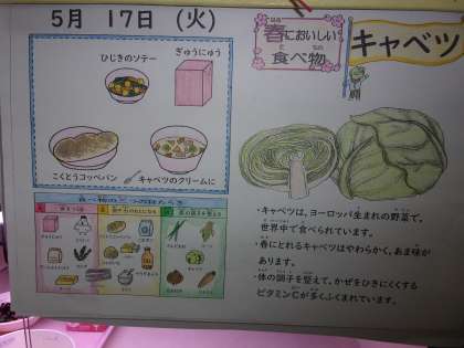 「キャベツのクリーム煮」は,春にとれたキャベツを使っており,春を感じられる献立でした。ふわっとやわらかく,甘みがあるキャベツと,給食室手作りのルーのとろみがよく合う献立でした!