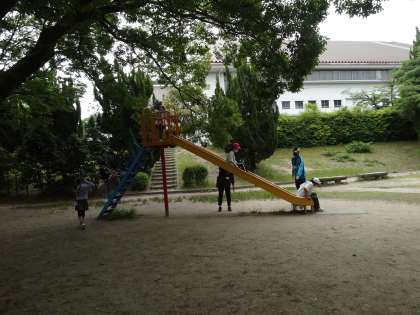 公園で遊ぶ時のルールの話を聞いて,みんな遊びをしました。「ころがしドッジボール」や「大縄跳び」としました。「ころがしドッジ—ボール」は,ボールをよけたり,転がして当てたりして,みんな楽しくゲームをすることができました。「大縄跳び」は,それぞれが好きな跳び方で楽しく跳びました。友だちが成功すると拍手をしたり,褒めたりして温かく和やかなムードで遊ぶことができました。ブランコや滑り台の遊具遊びも楽しみ,みんな帰るころにはヘトヘトでした。楽しい一日が過ごせてよかったです。お弁当のご用意ありがとうございました。
