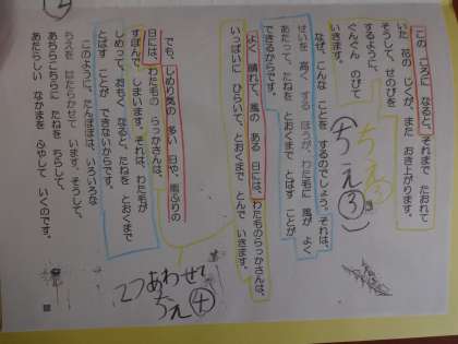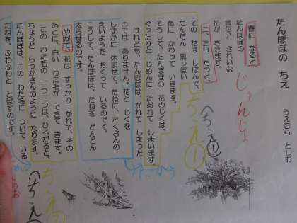 順序を表す言葉は赤色,たんぽぽのちえは黄色,そしてちえの説明を青色で色分けしていきました。