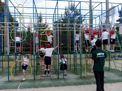 はじめは怖くてそろりそろりと総合遊具に挑戦していた子どもたちも,今ではぶら下がったり,棒を上ったり下りたり,鉄棒のようにくるりと回ったり,どんどん技が増えています。「先生,できること増えたよ。」「来て!見て!」先生たちもきょろきょろ忙しく見ています。