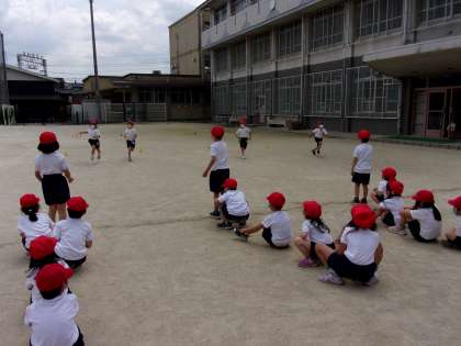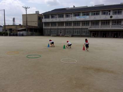かけっこ・リレー遊びでも様々なことに挑戦しています。コーンを回る・ジャンプする・ぐねぐね道を走る・バトンを使うなど,だんだんと難しいルールを付け加えて楽しんでいます。汗をかいて一生懸命走っています。リレー勝負に勝ちたい気持ちも高まってきています!