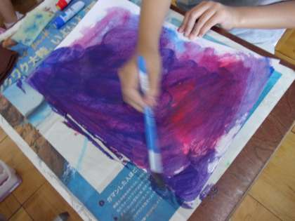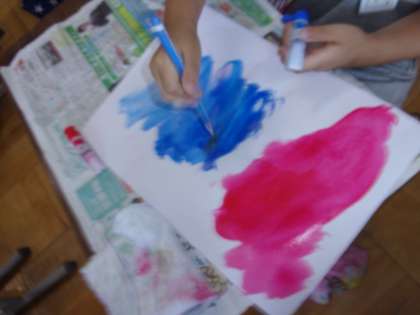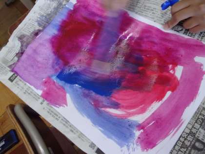 赤と青の絵の具を画用紙に直接出し,水でサラサラと混ぜていきます。きれいな紫色のあじさい色が出来上がりました。この画用紙を使って,あじさいを作るのが楽しみですね。
