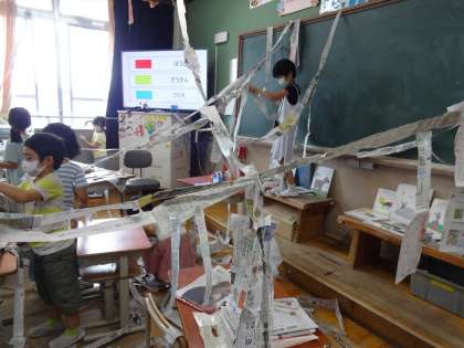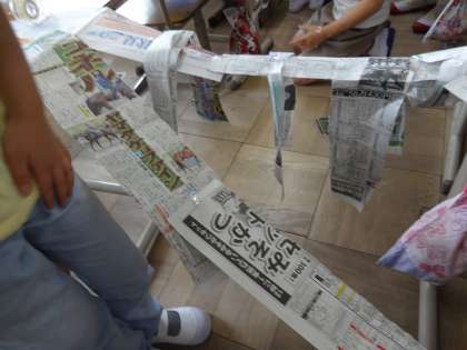 図画工作で新聞紙を切り,つなぎ合わせています。