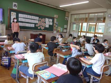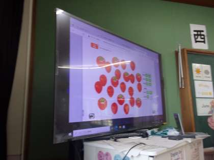 外国語活動では,数を数える学習をしています。フルーツや野菜の数を数えて,英語でその数を言っていました。