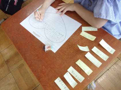 友だちのいいところを見つけて,付箋に書き,その友だちの机に貼りに行きます。貼ってもらった付箋を見て,自分のいいところをワークシートのハートの中にまとめていきました。