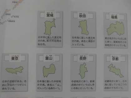 都道府県の形と主な特産品や地形などの情報をもとにして,それぞれの特色について調べました。例えば,