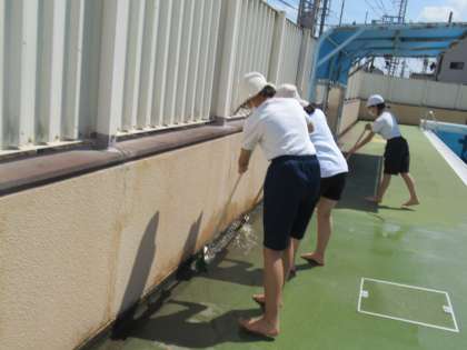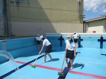 水泳学習が始まる前,6年生が学校を代表してプール清掃をしました。