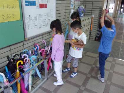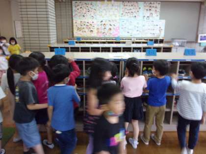 休み時間,ふと男子トイレを見ると,スリッパをしゃがんで整えている子がいます。帰りの会では,自分の用意の後,クラスの水筒入れを見て,まだ取りに行けていない友だちにせっせと届けている子もいます。こんな素敵な姿を目指して,まずは自分の後片付けを最後まで取り組んでいきます。